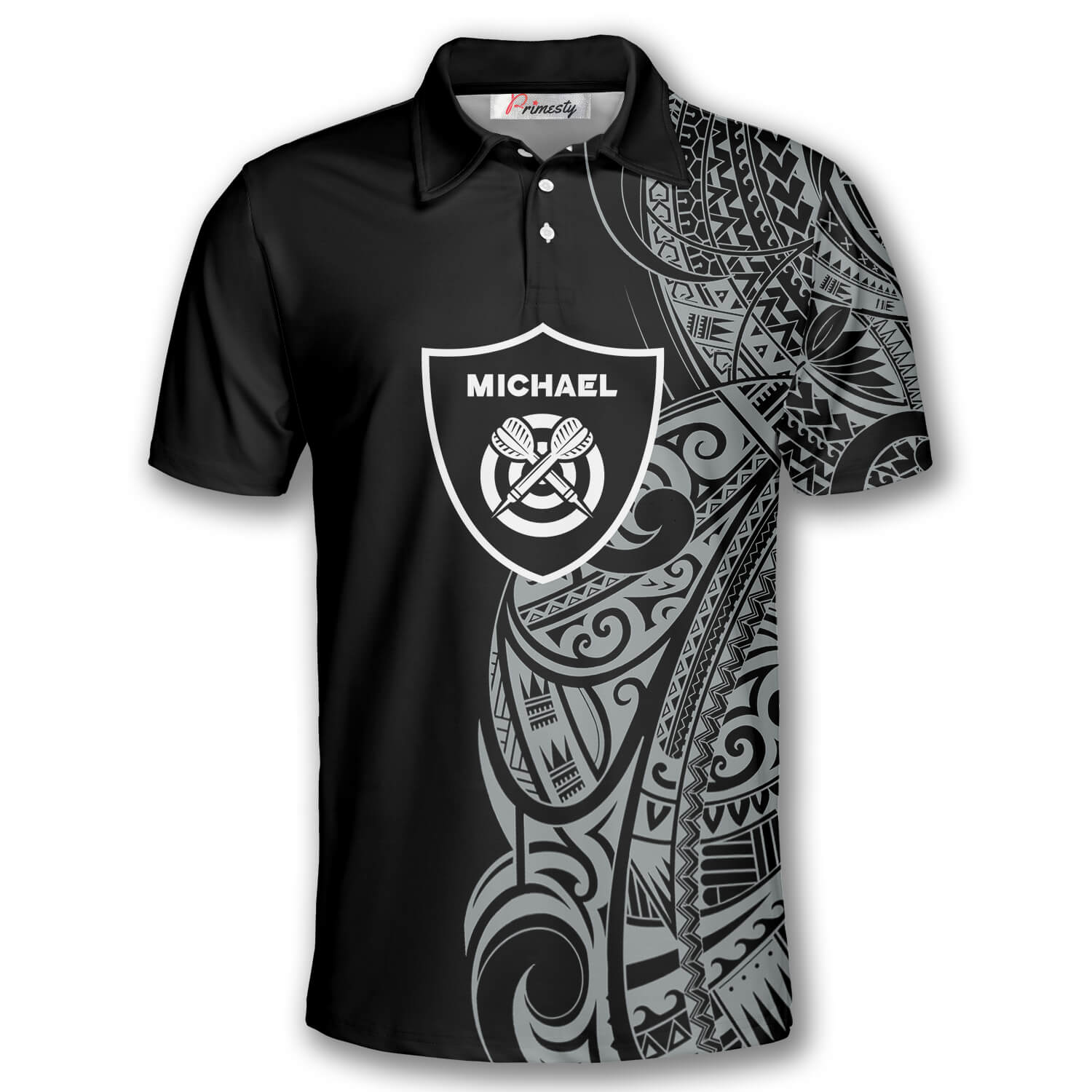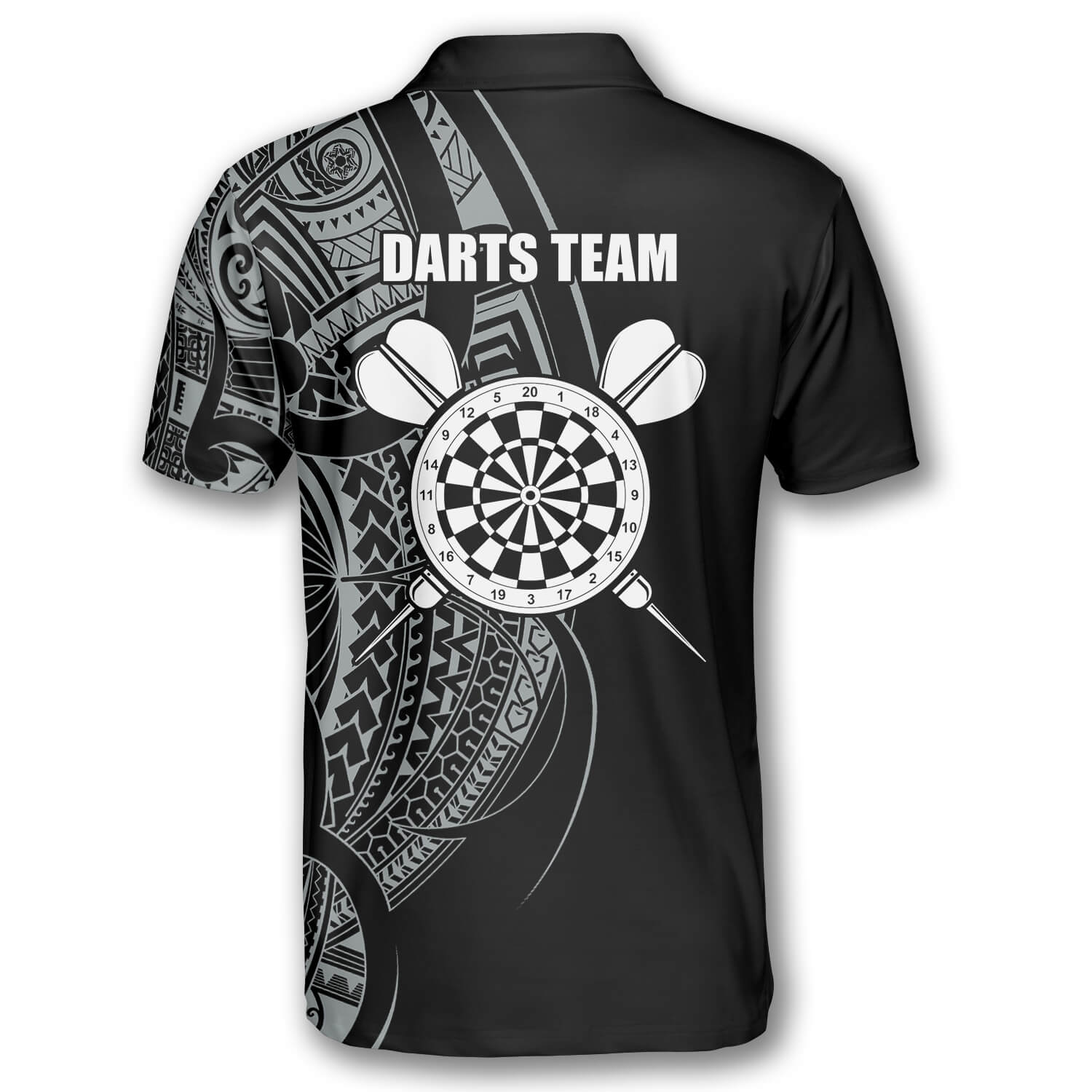 3D All Over Printed Dart Shirt, Shield Black White Tribal Tattoo Custom Darts Shirts For Men, Custom Name And Team Name Dart Polo Shirt