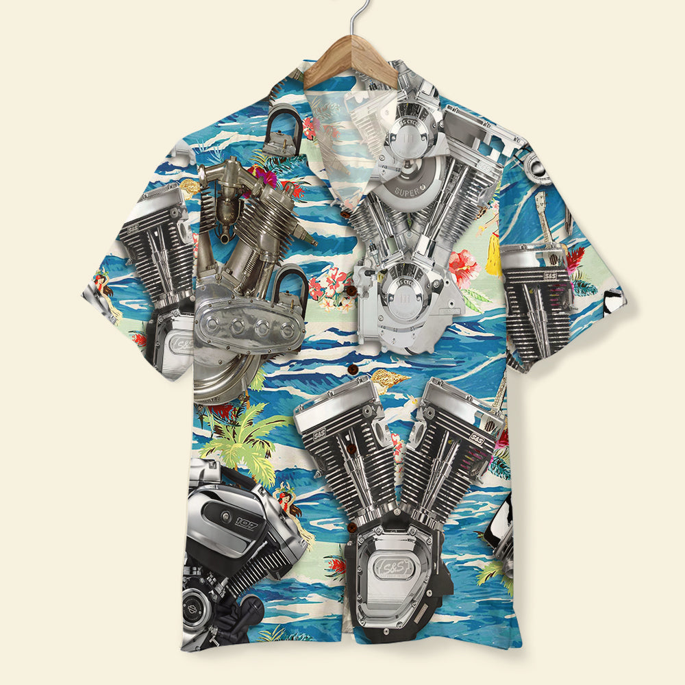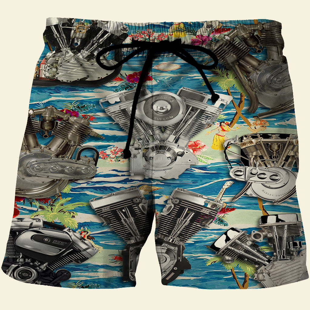 Biker Hawaiian Shirt And Men Beach Shorts, Seamless Motorcycle Engine Pattern
