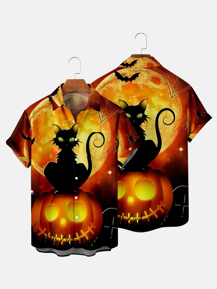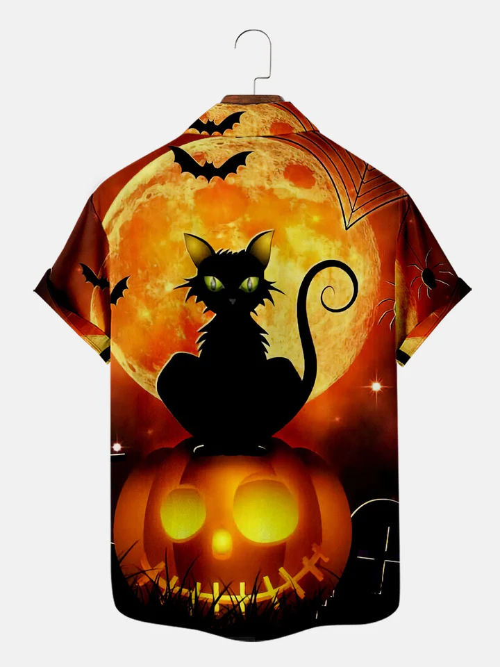 Black Cat And Pumpkin Halloween Shirt Collar Vintage Shirts For Men, Halloween Gift