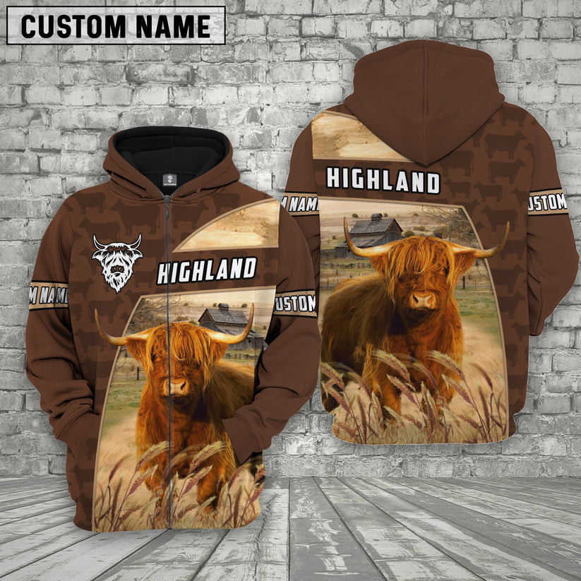 Highland Cattle Brown Leather Personalized 3D Zip Hoodie