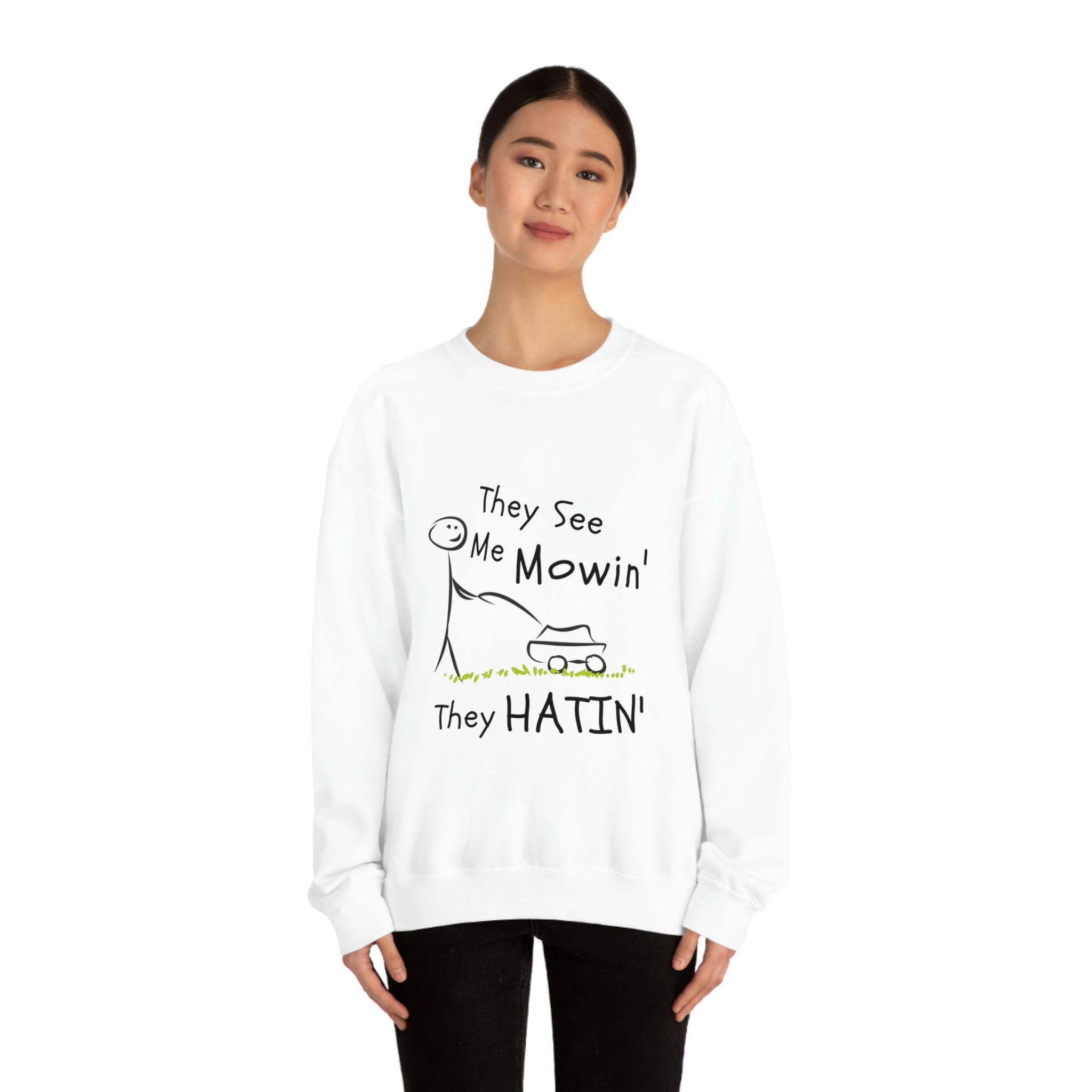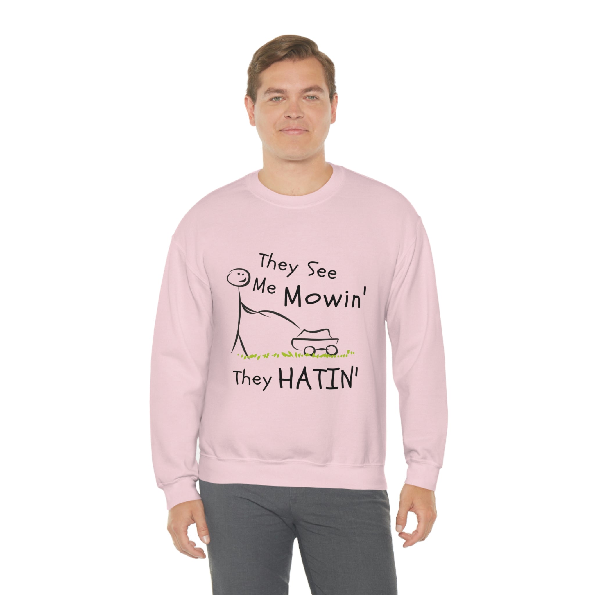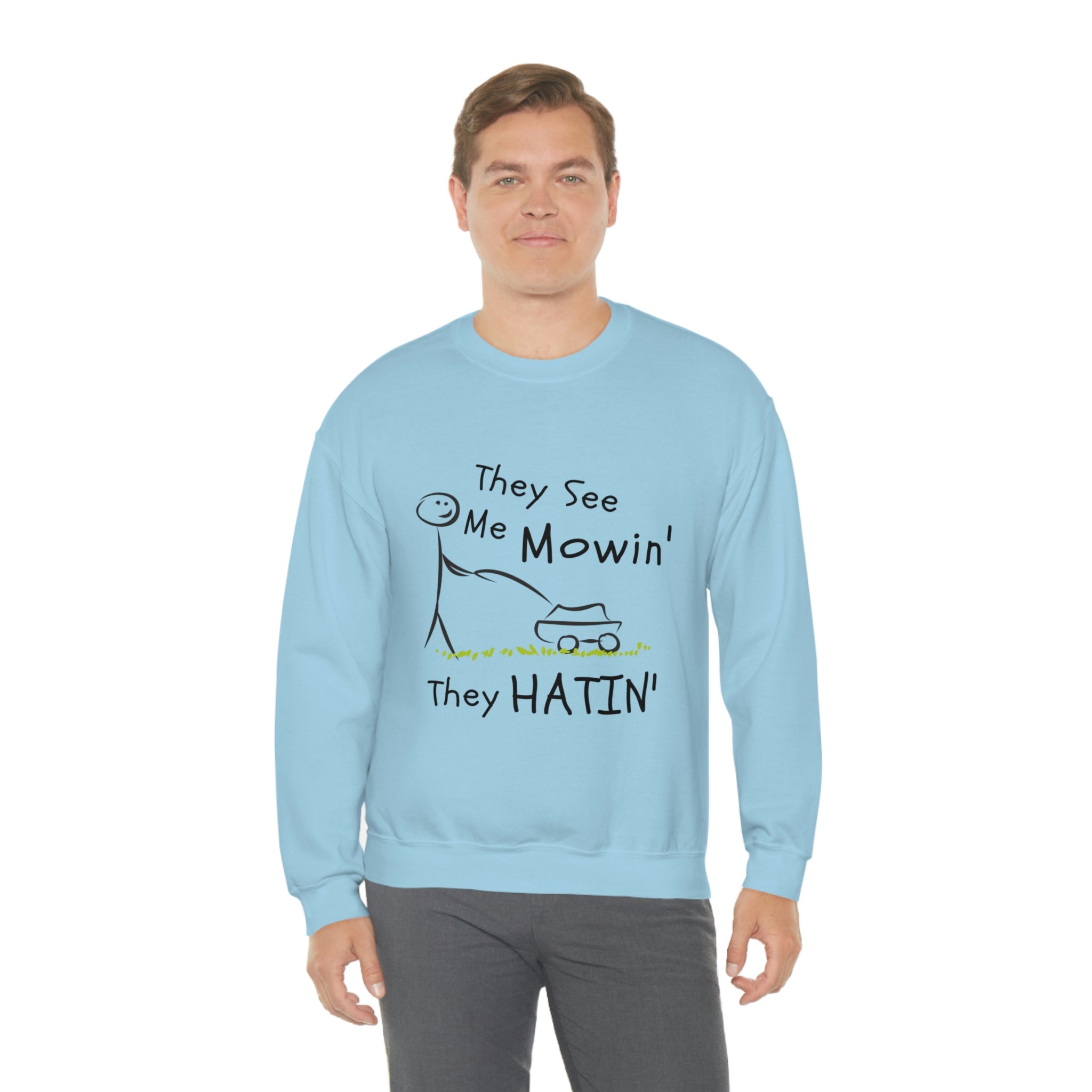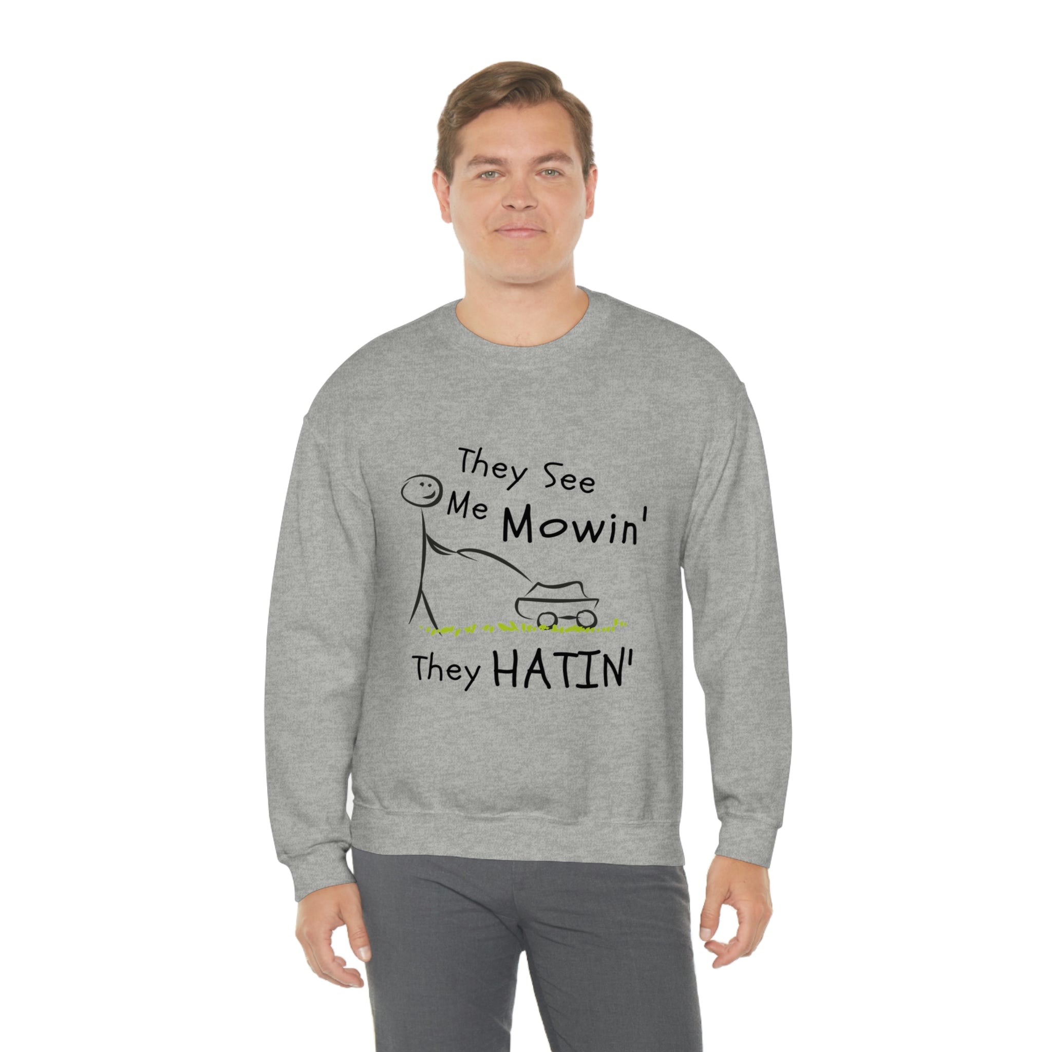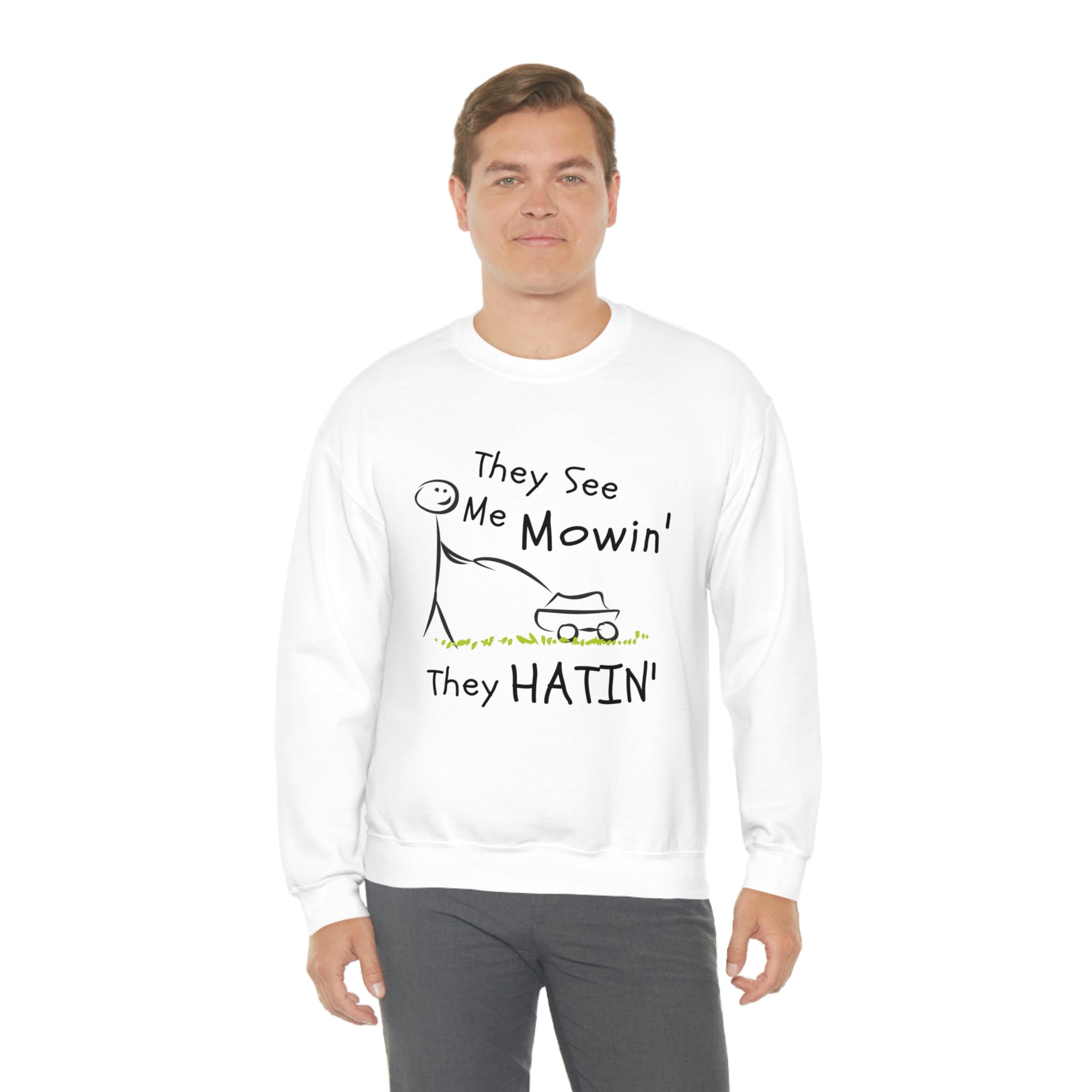 Humorous I’M Mowin’ They’Re Hatin’ Pun Saying Gift | Hilarious Yardwork Lawn Mower Men Women Unisex Crewneck Sweatshirt