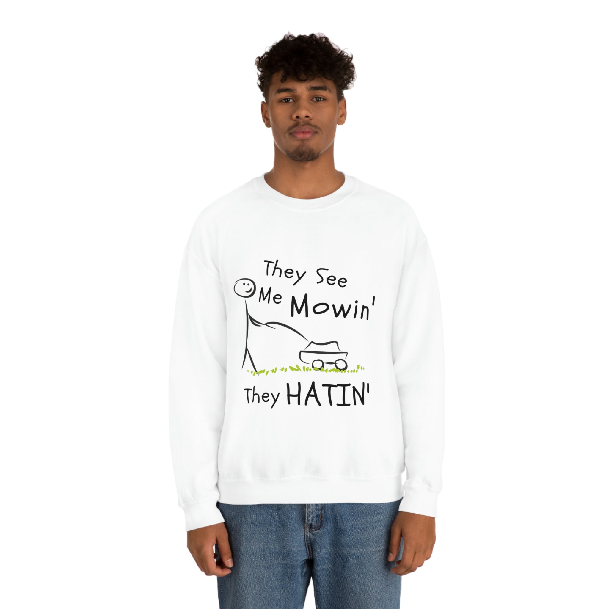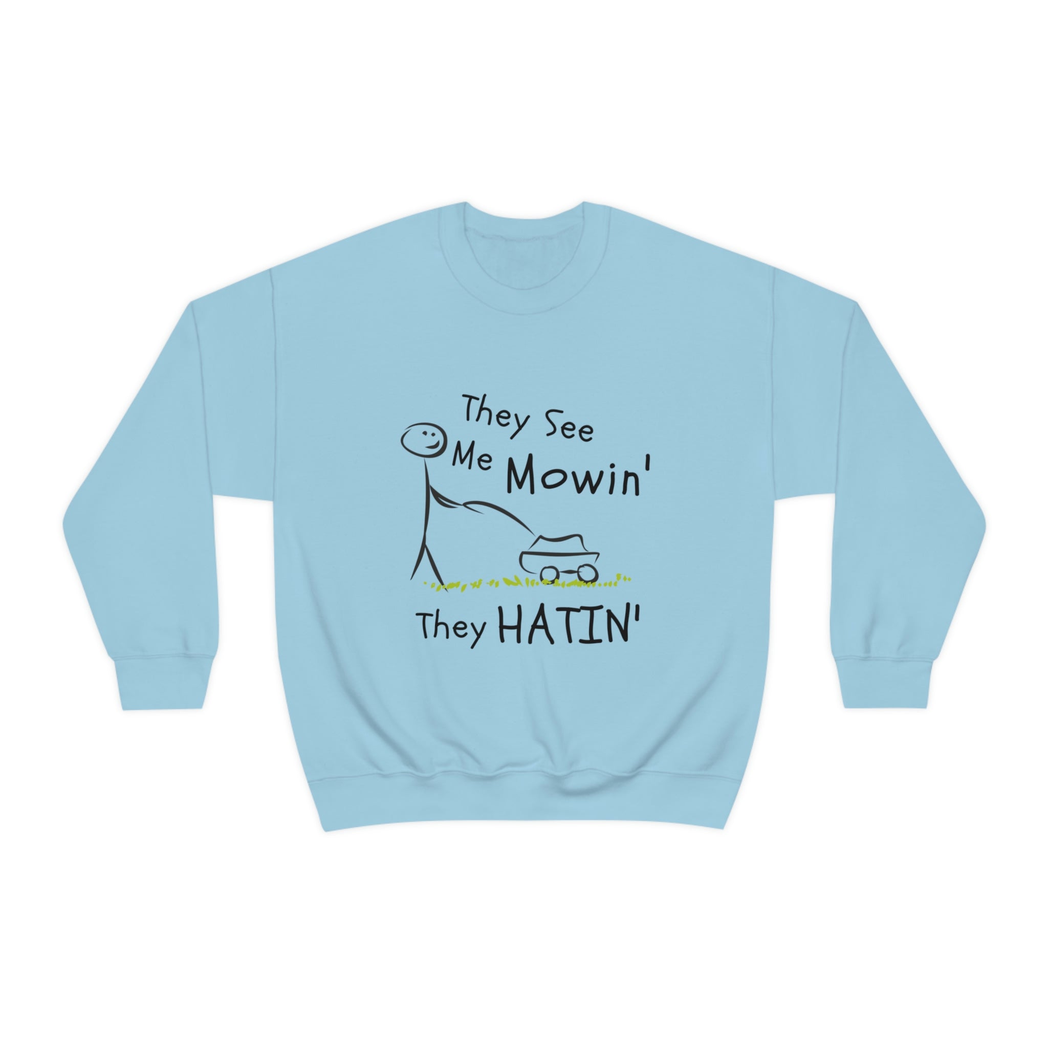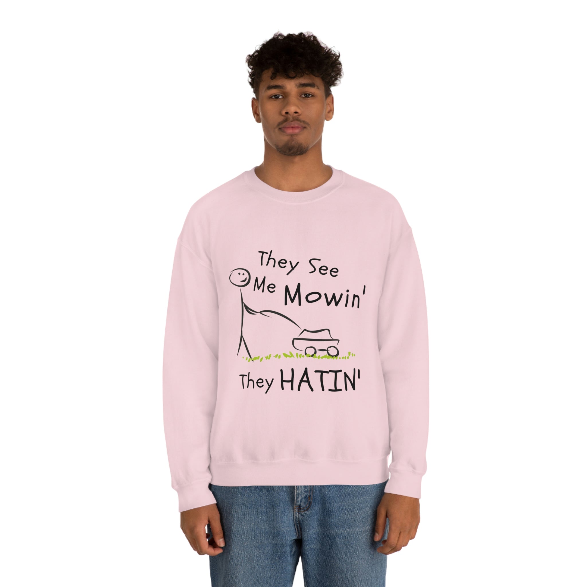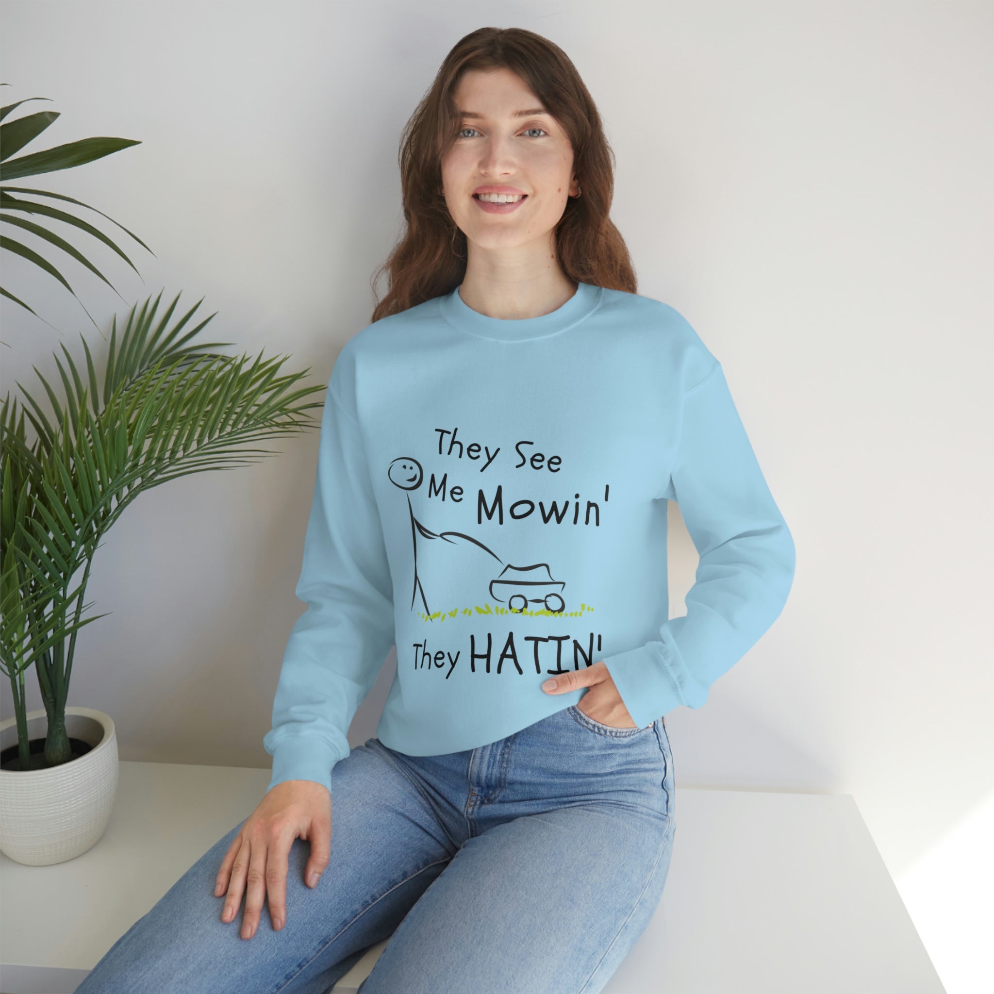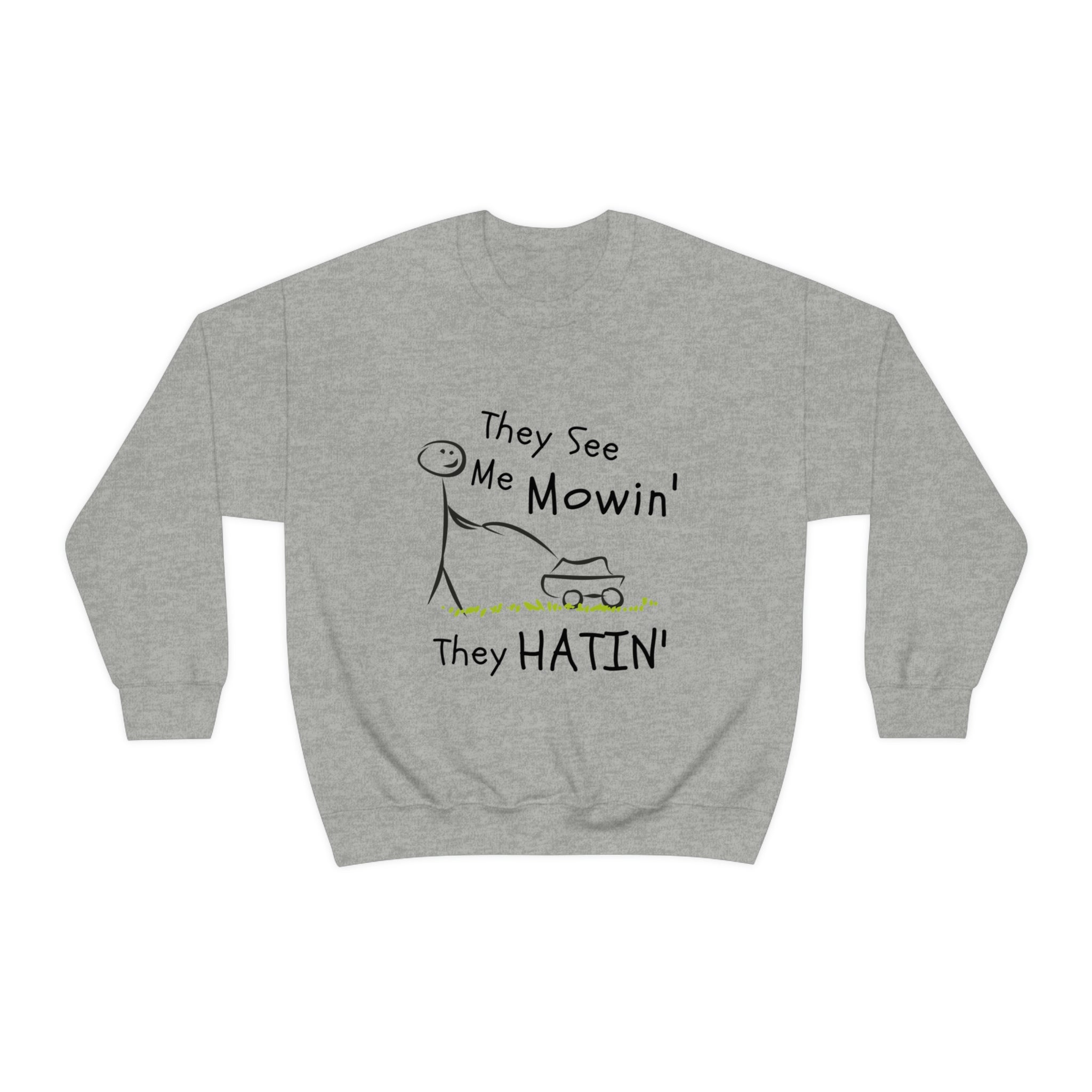 Humorous I’M Mowin’ They’Re Hatin’ Pun Saying Gift | Hilarious Yardwork Lawn Mower Men Women Unisex Crewneck Sweatshirt