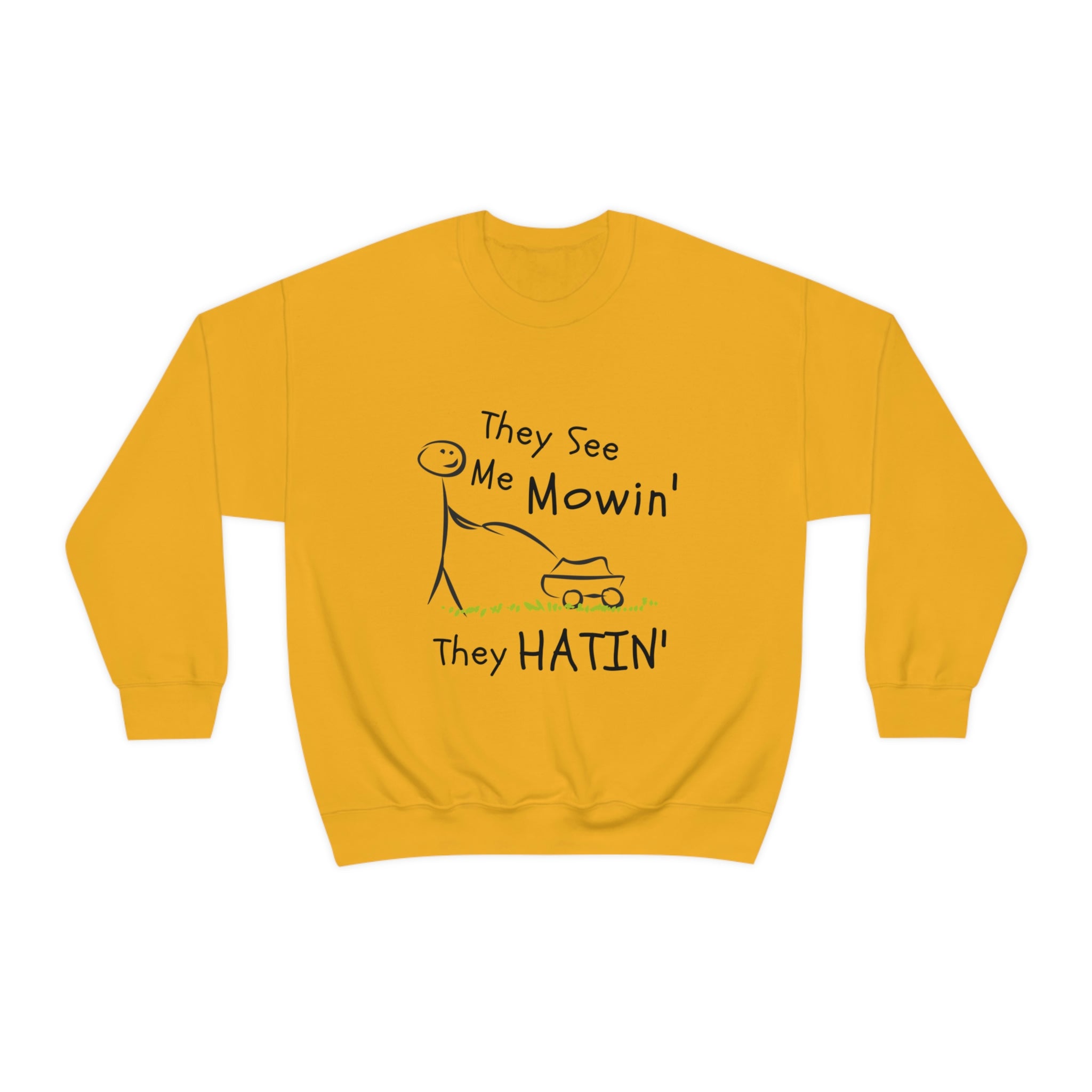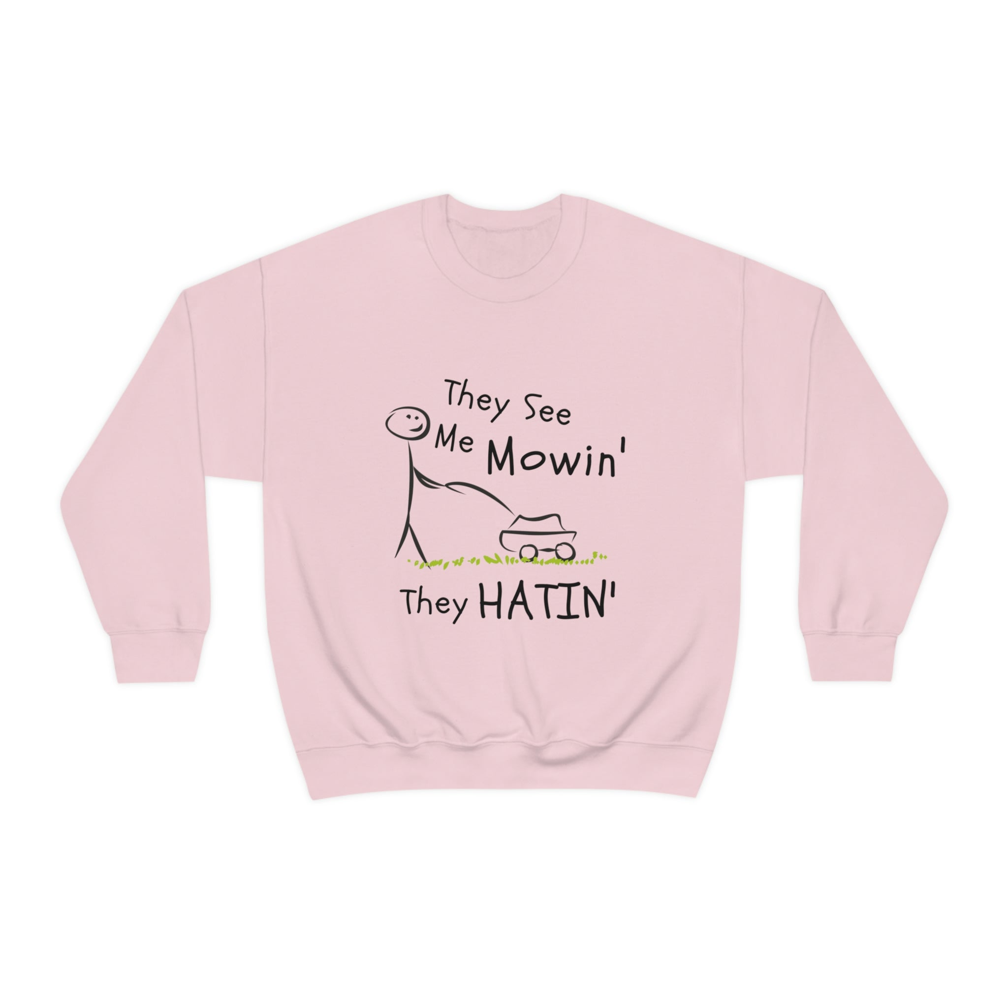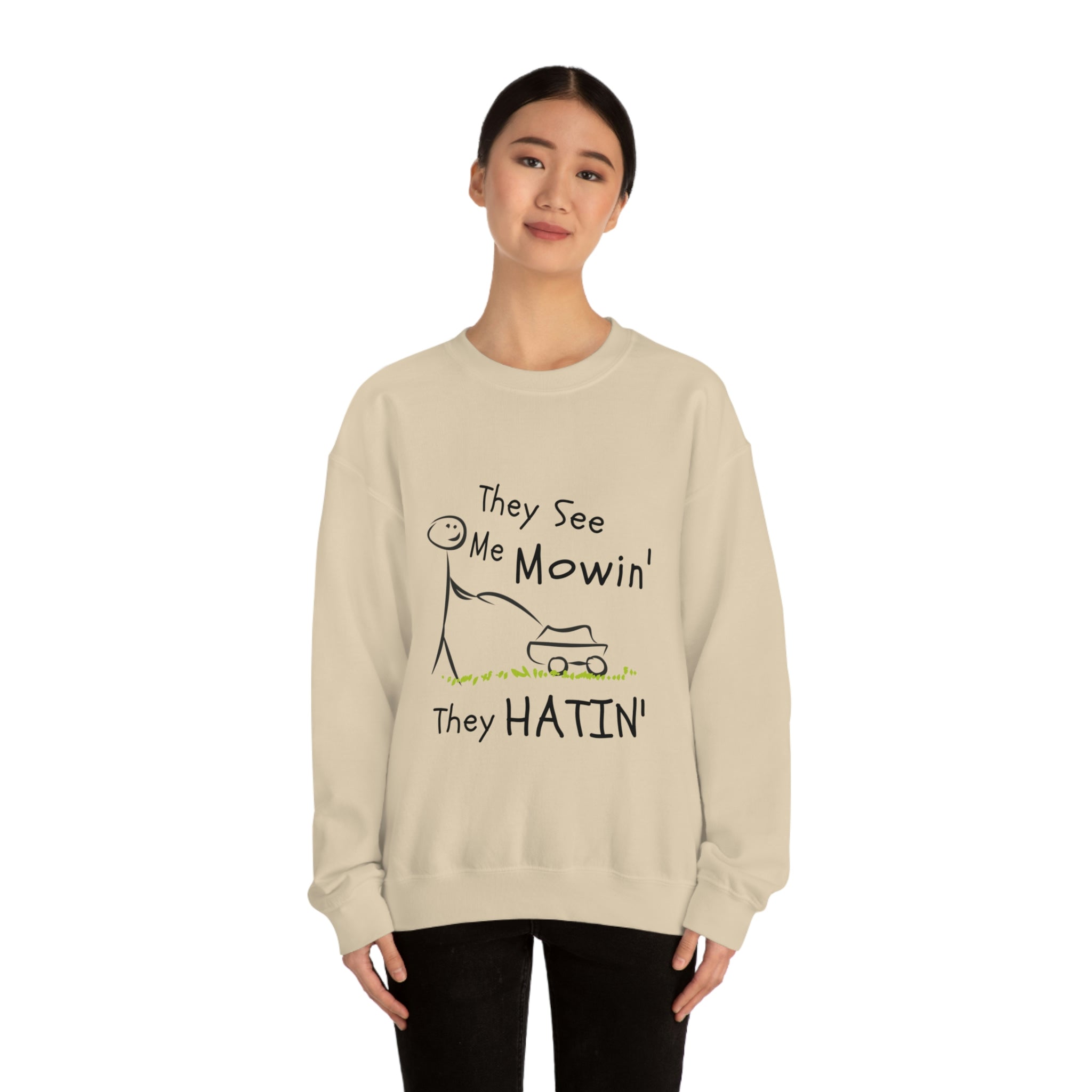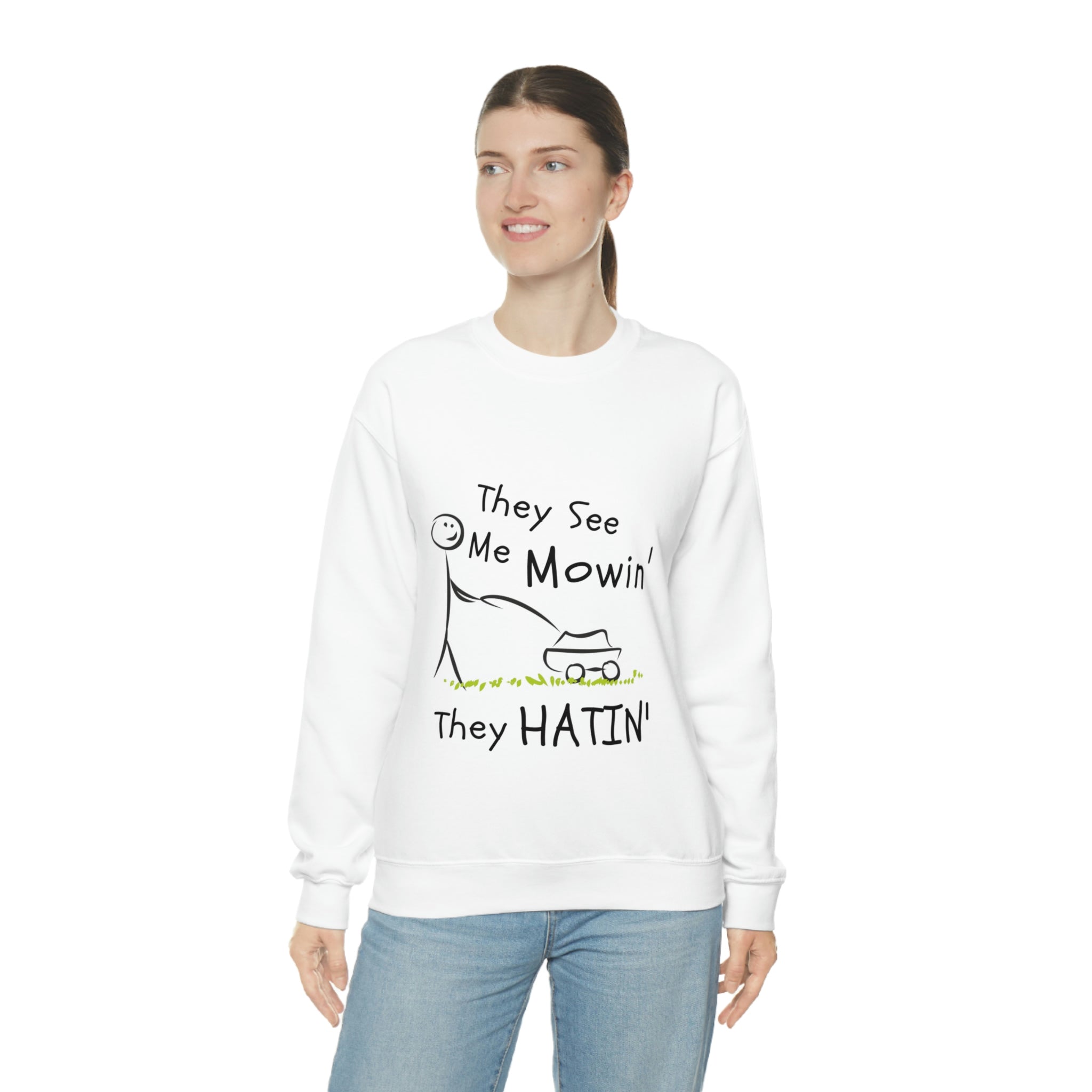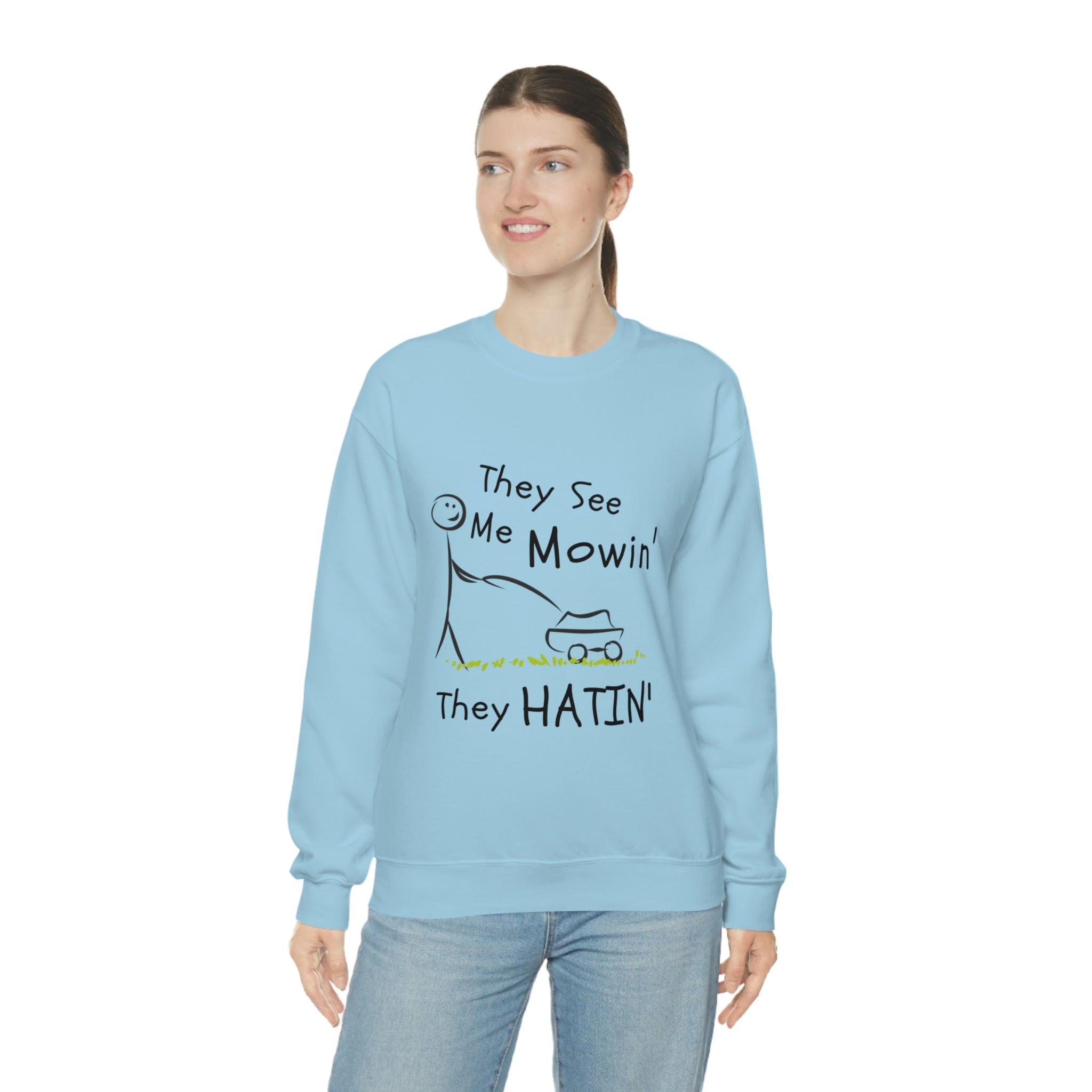 Humorous I’M Mowin’ They’Re Hatin’ Pun Saying Gift | Hilarious Yardwork Lawn Mower Men Women Unisex Crewneck Sweatshirt