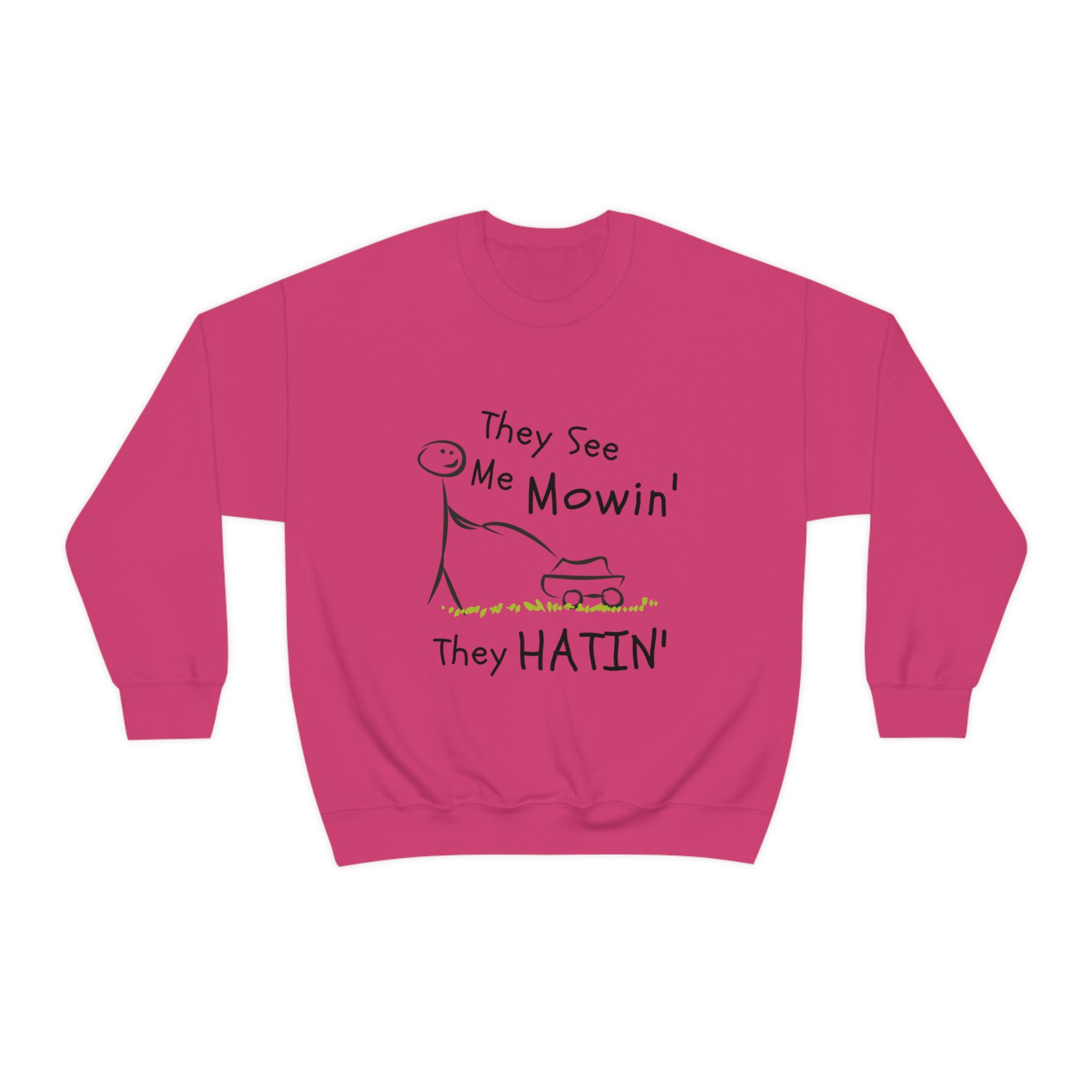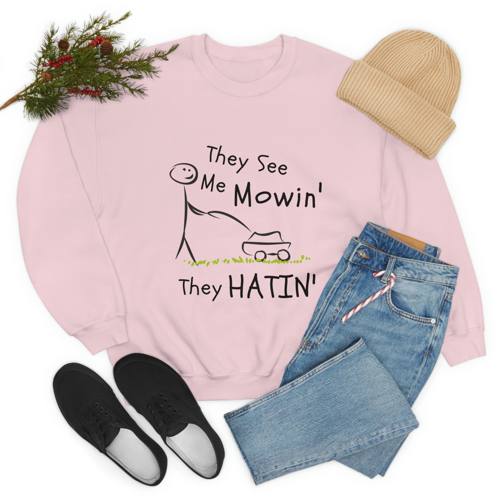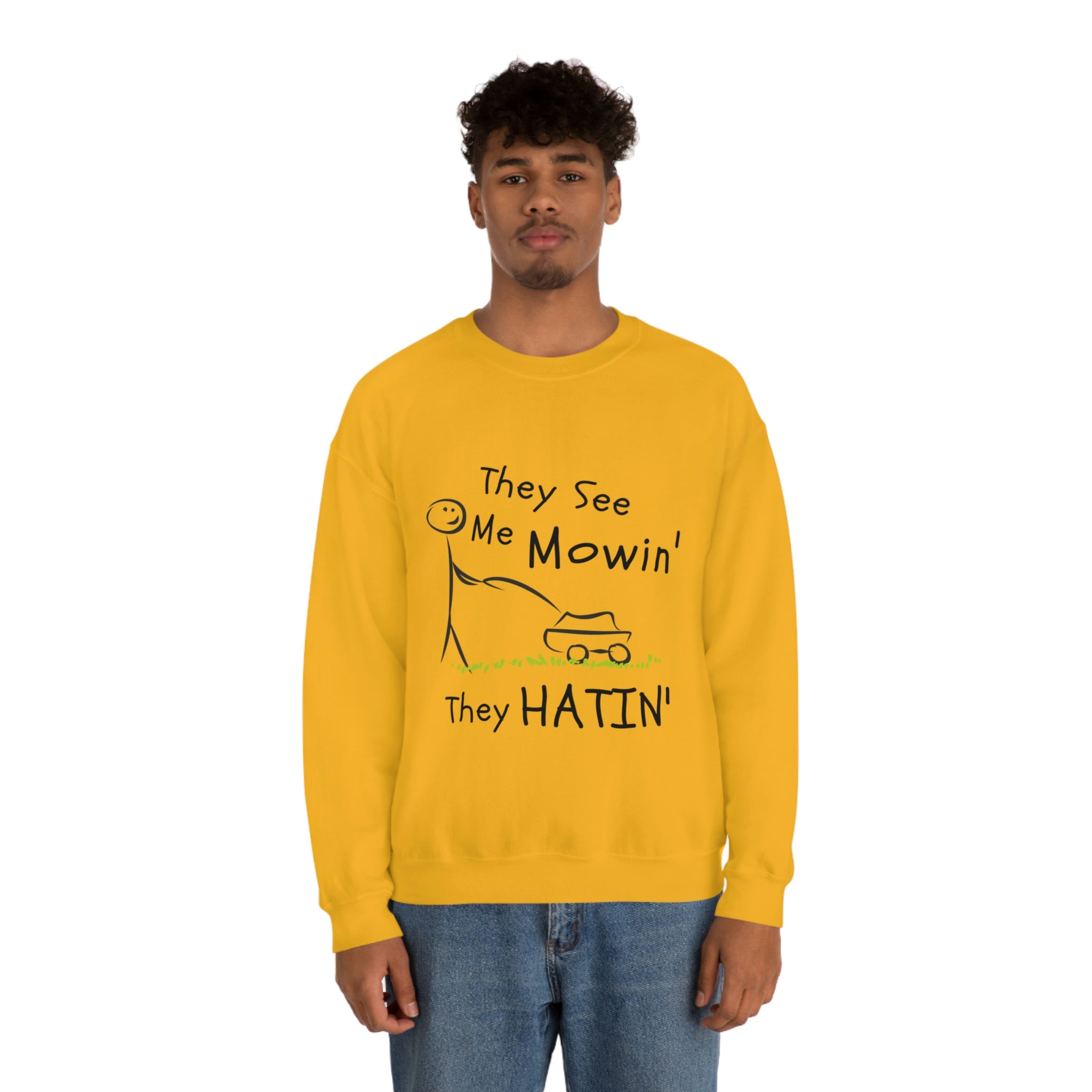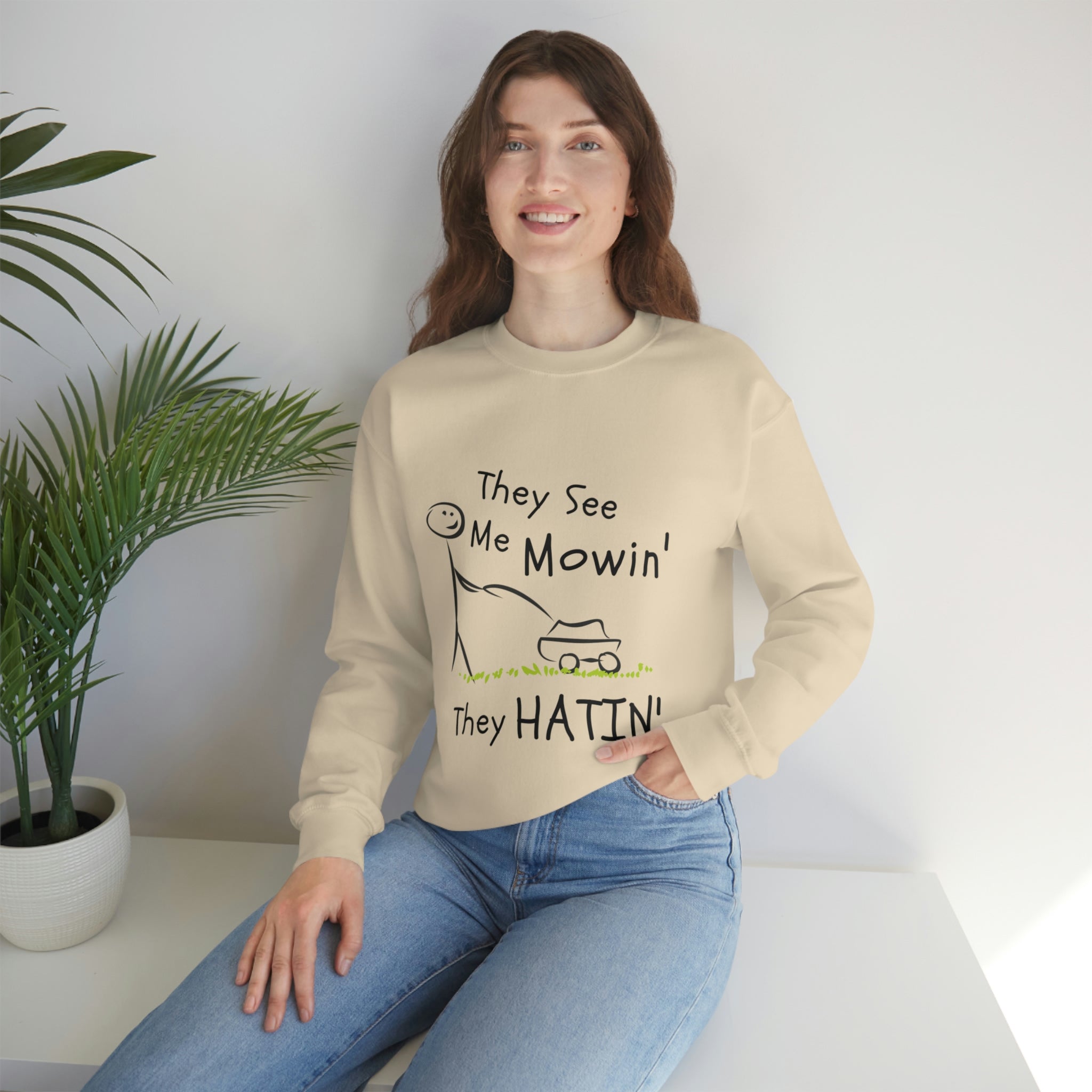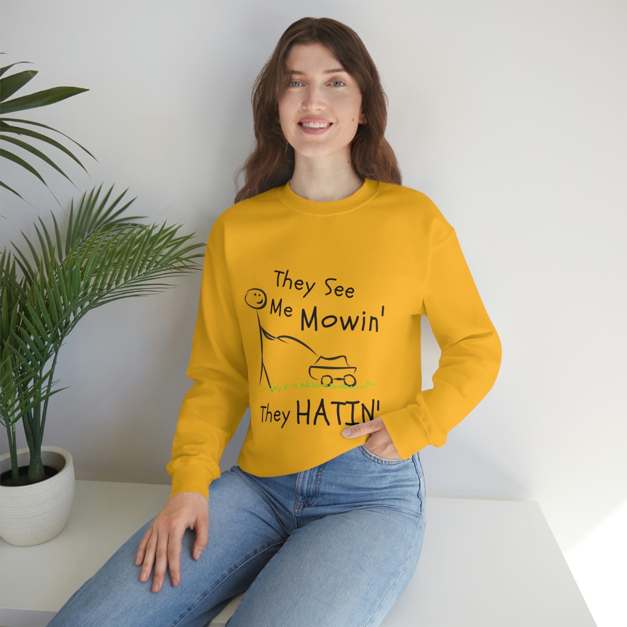 Humorous I’M Mowin’ They’Re Hatin’ Pun Saying Gift | Hilarious Yardwork Lawn Mower Men Women Unisex Crewneck Sweatshirt
