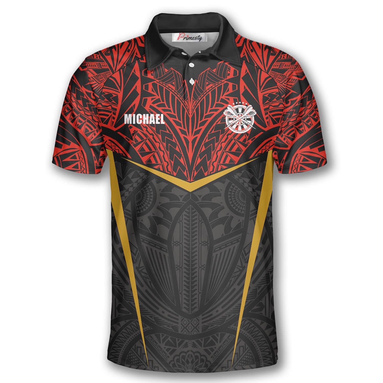 Tribal Red Yellow Custom Darts Shirts For Men, 3D All Over Printed Dart Shirt, Custom Name And Team Name Dart Polo Shirt