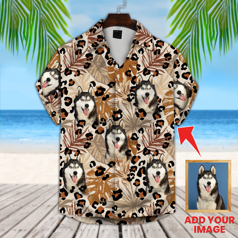 Turquoise And Blue Tropical Leaves Pattern Short-Sleeve Hawaiian Shirt, Custom Photo Dog Floral Aloha Shirt
