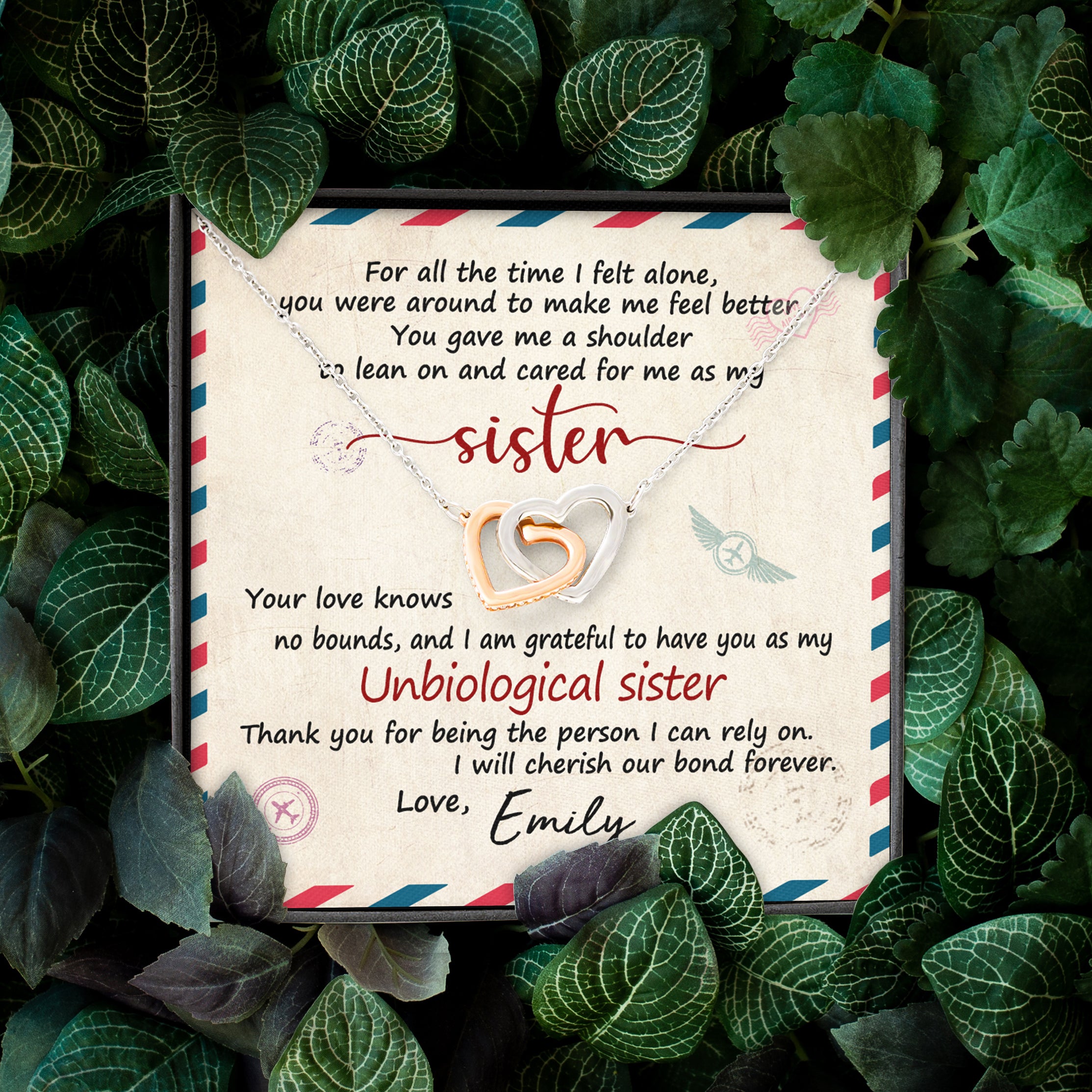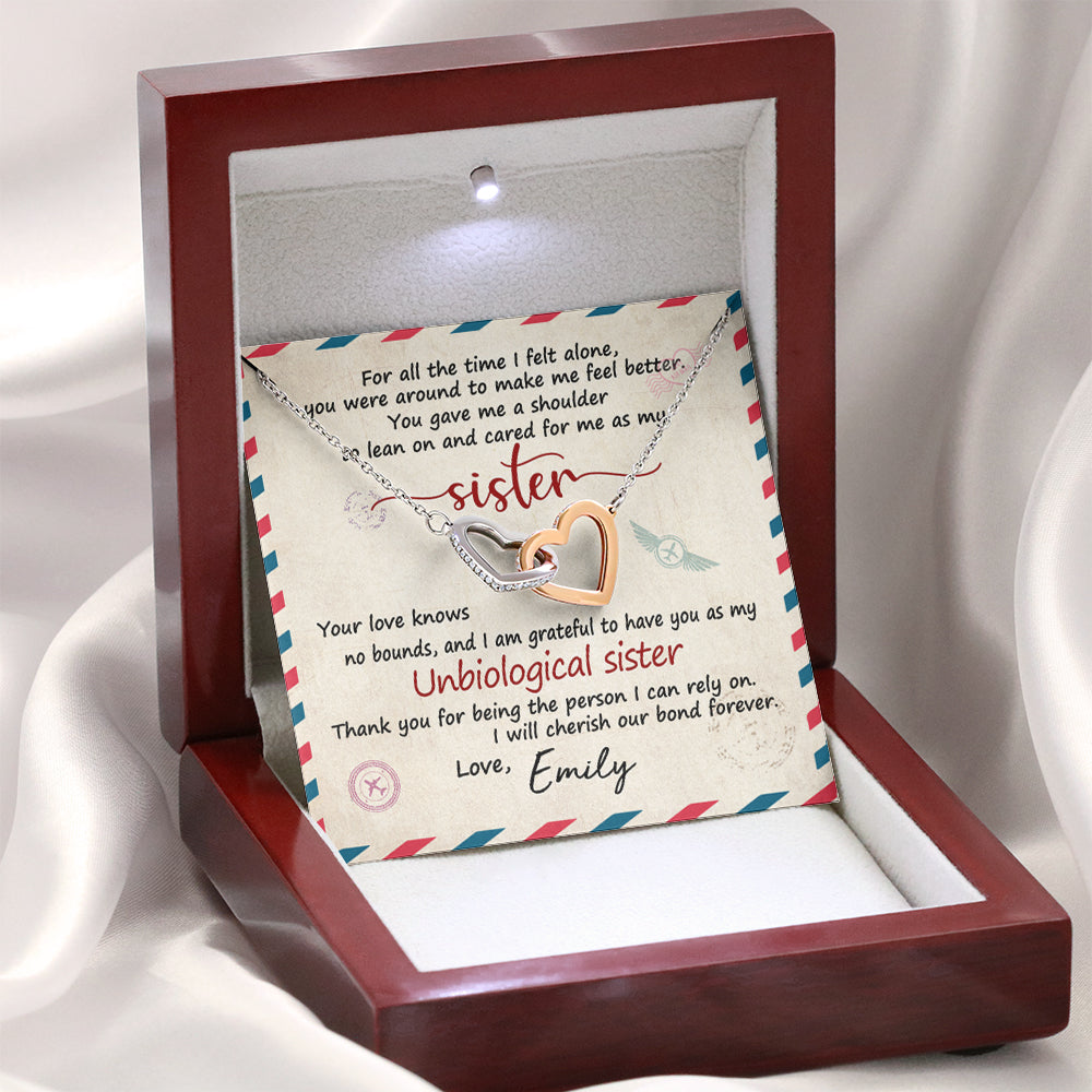 Unbiological Sister Interlocking Hearts Necklace – Custom Name – Stamp Postage