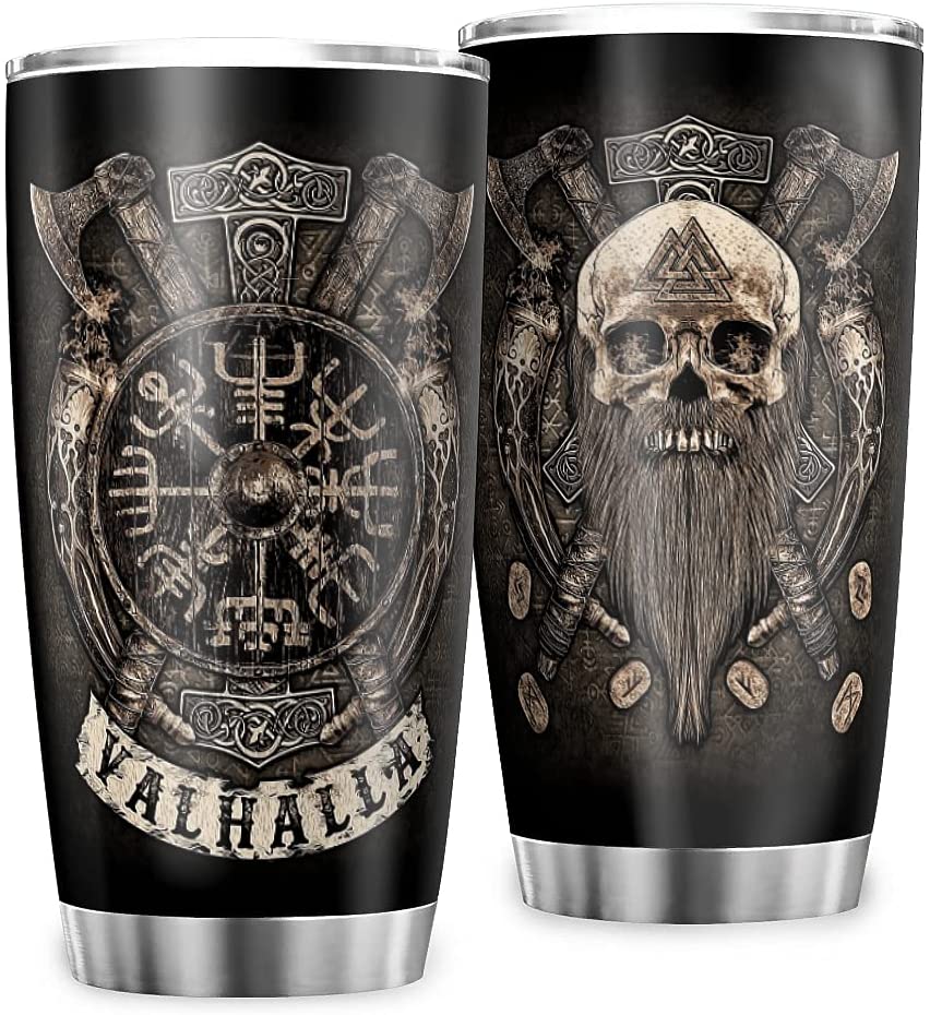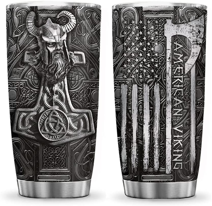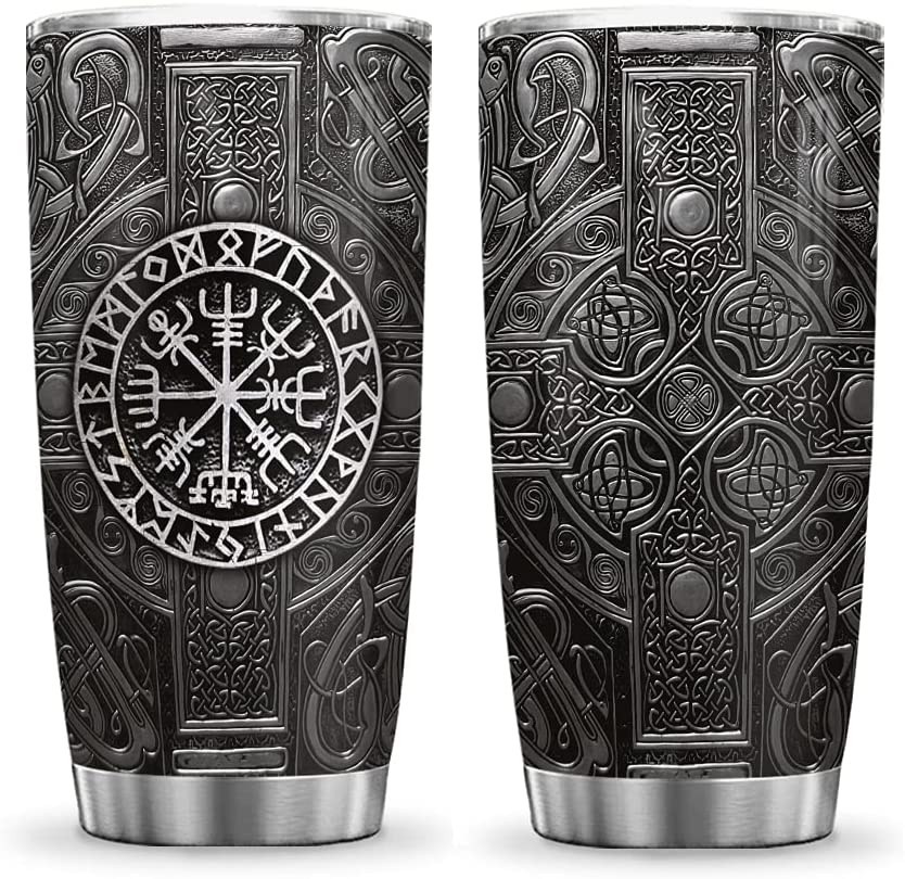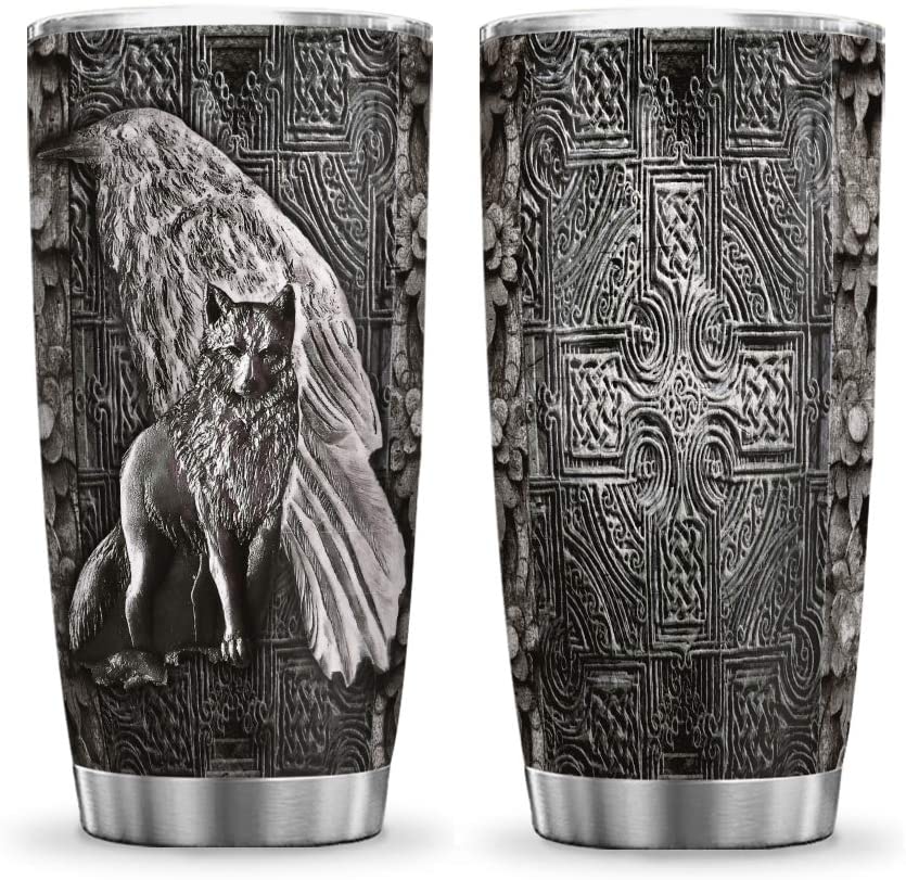 Viking 20Oz Stainless Steel Tumbler, Wolf And Raven Viking Celtic Tumbler Cup With Lid