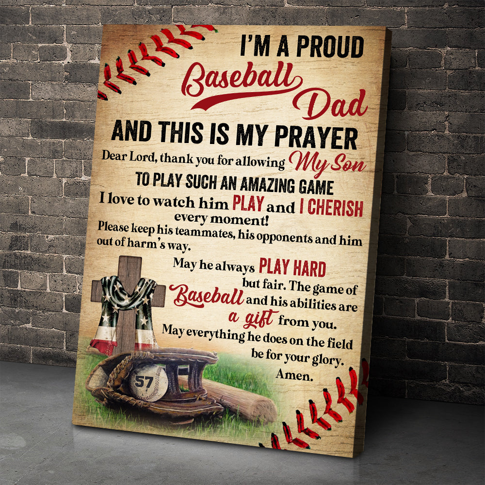 Vintage American Baseball Poster – Custom Name, Number – I’M A Proud Baseball Dad – Baseball Equipment & Cross
